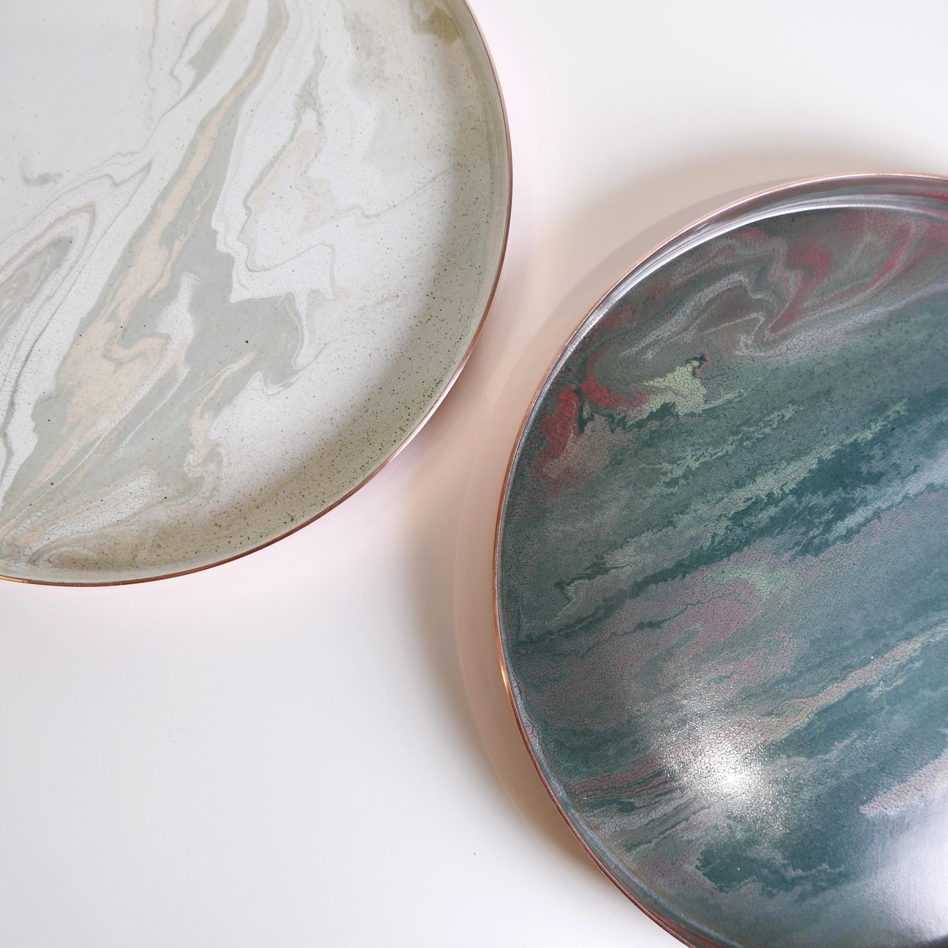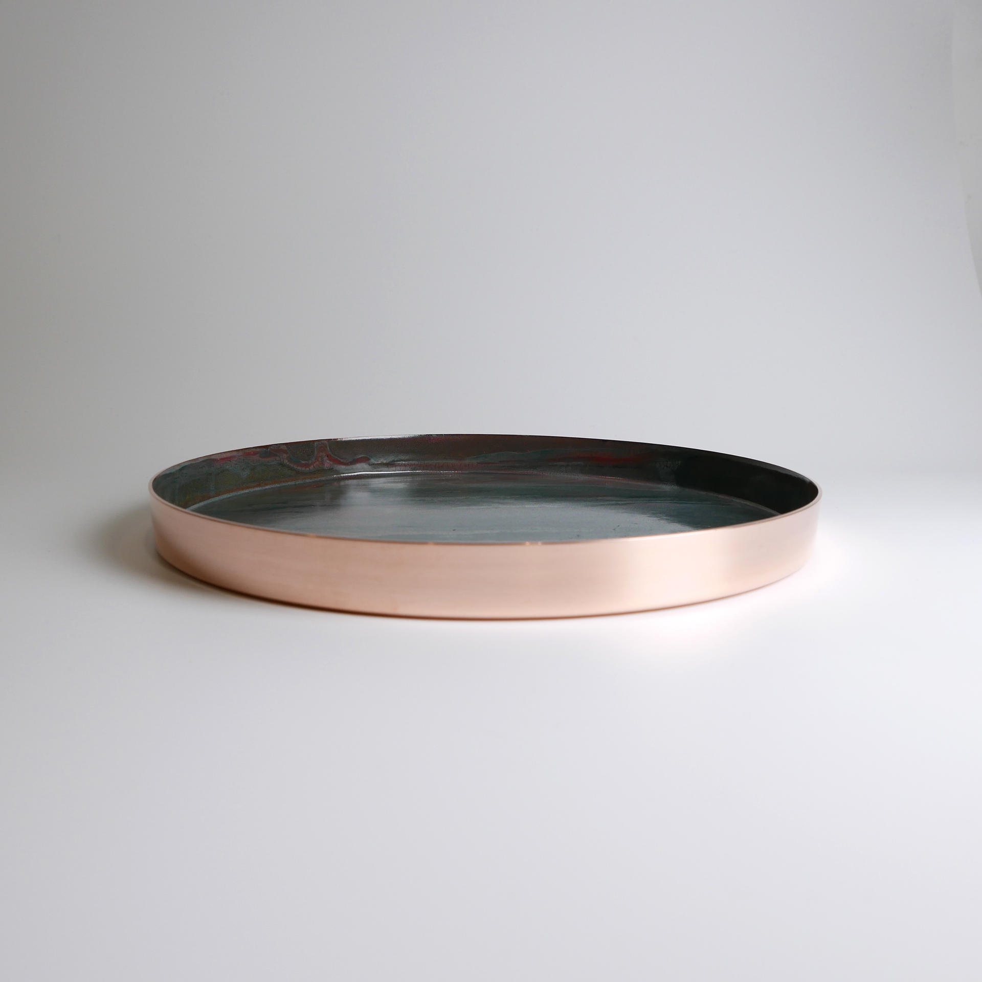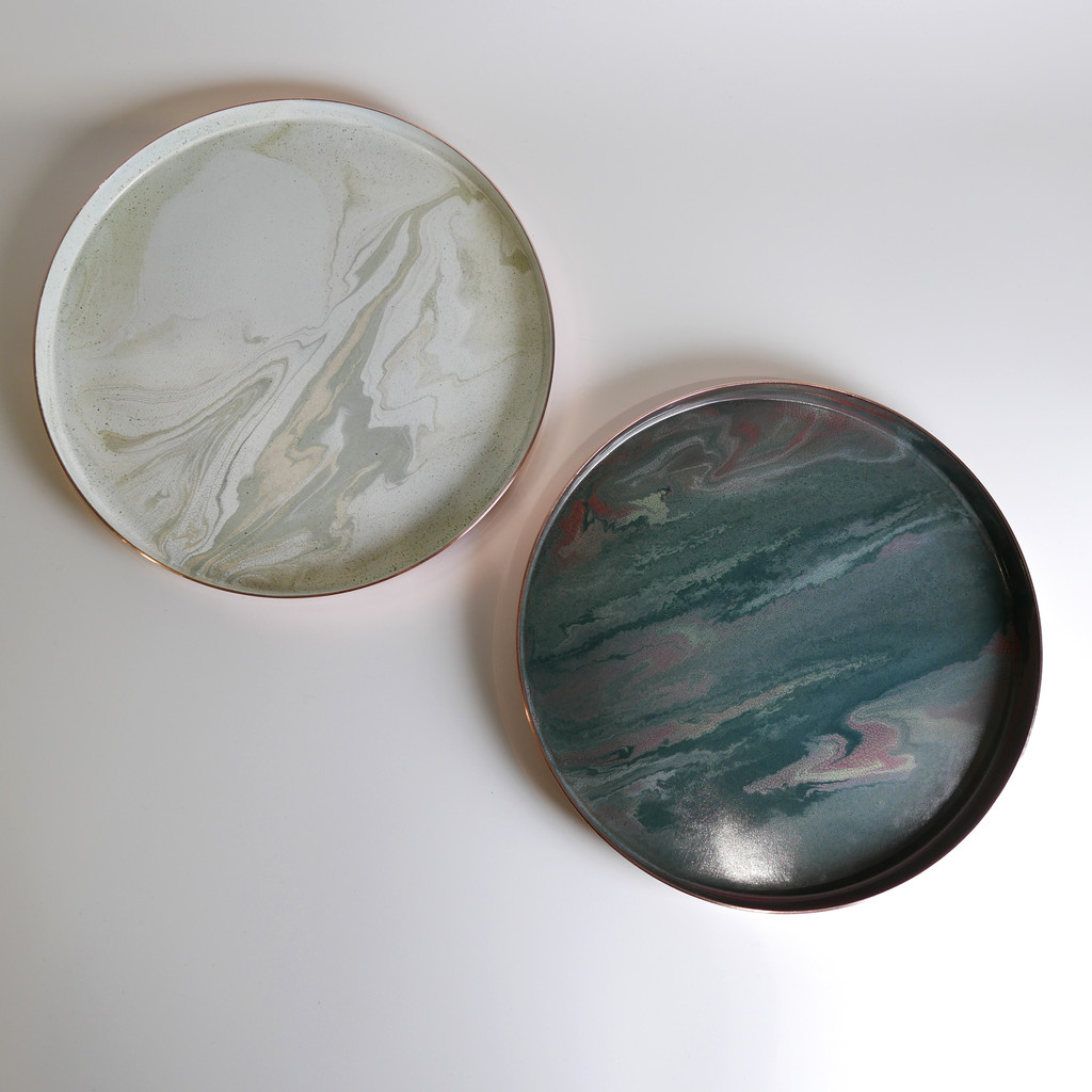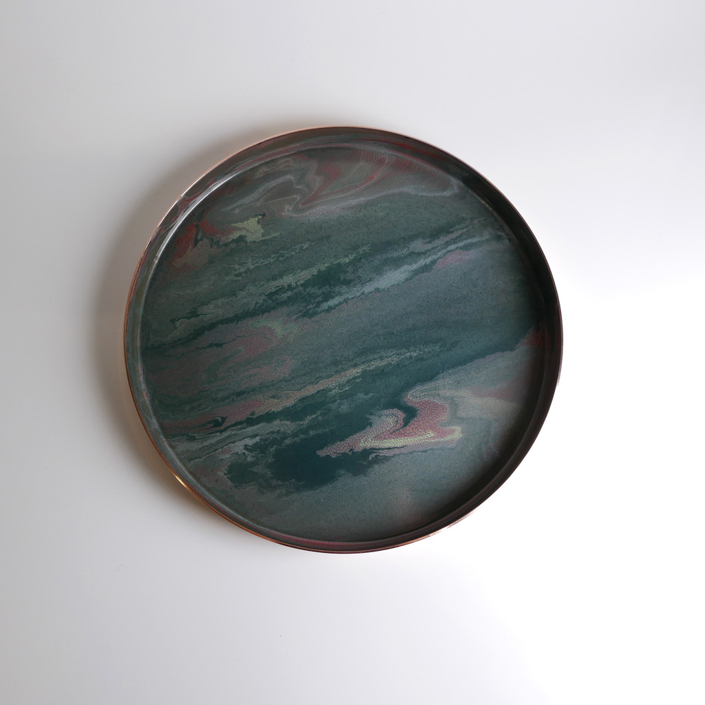매번 조금씩 다른 유약의 패턴과 색상, 그리고 금속 판재가 열을 받으면서 변형되는 형태.