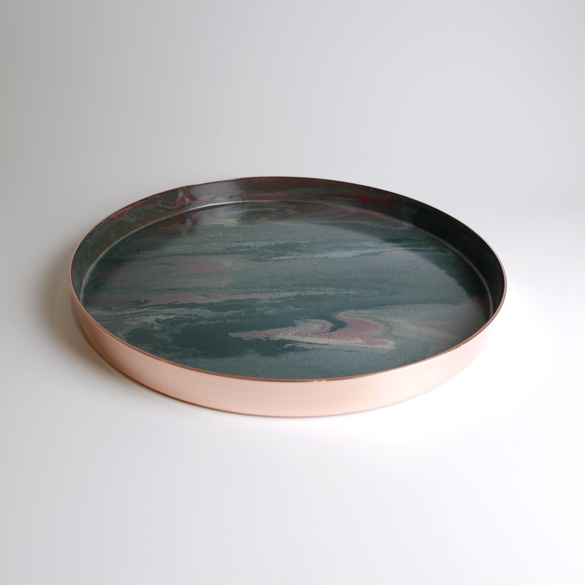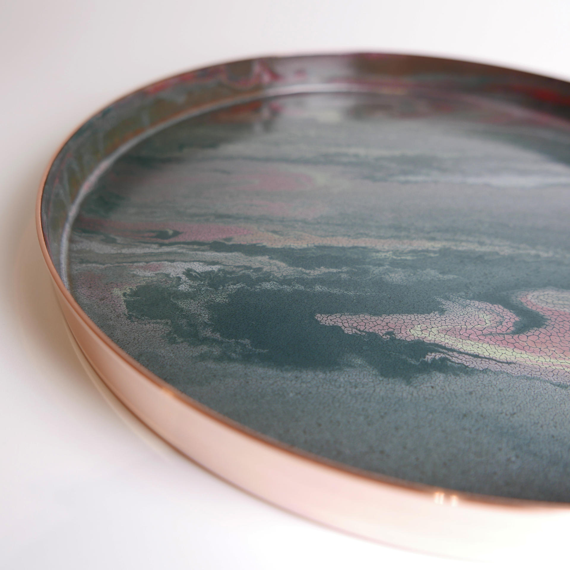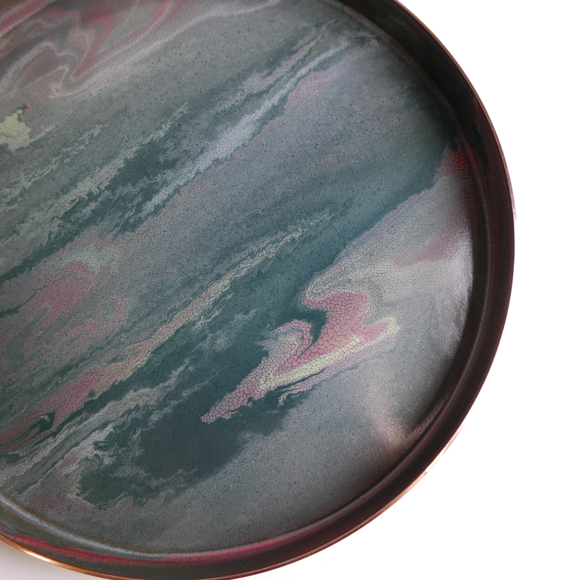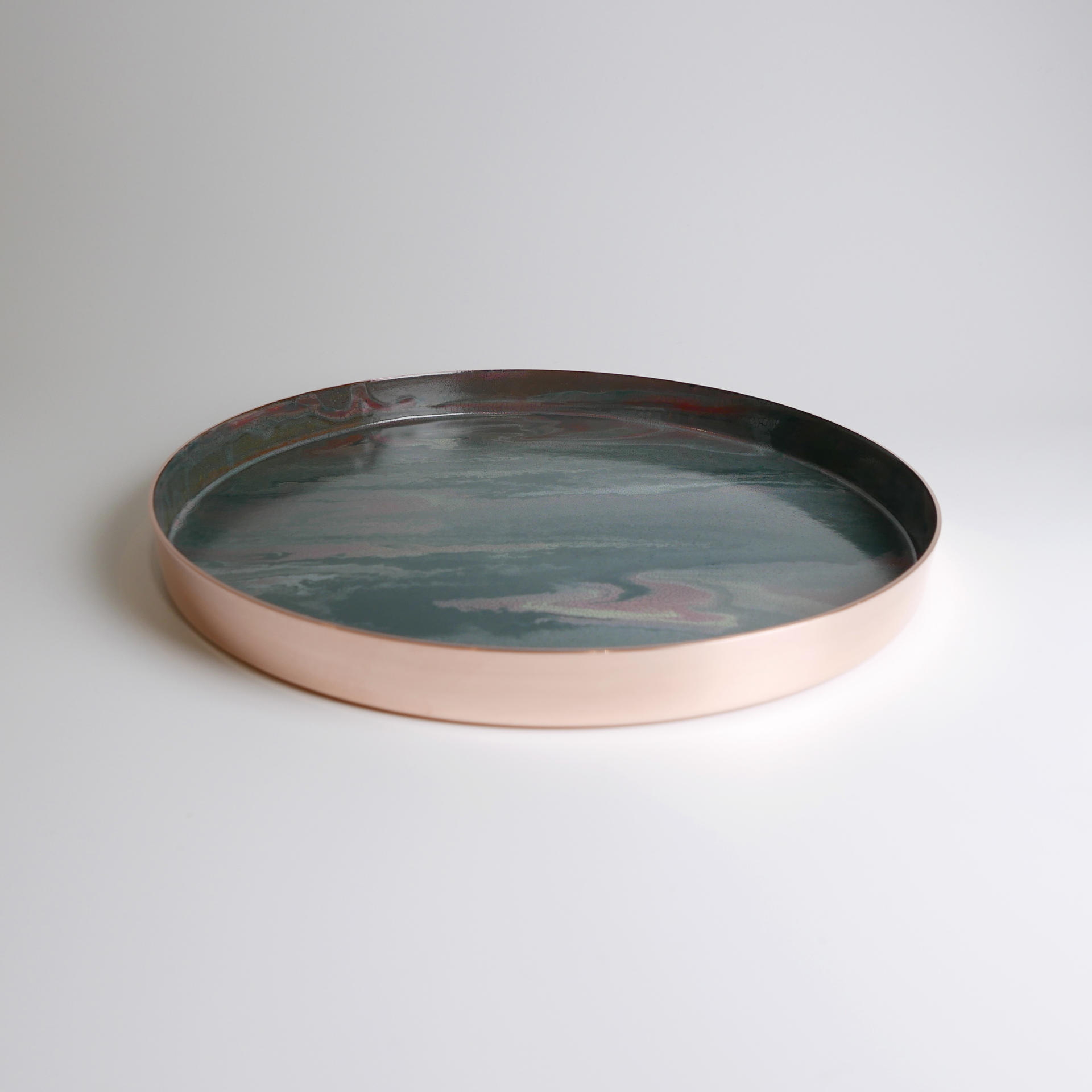 매번 조금씩 다른 유약의 패턴과 색상, 그리고 금속 판재가 열을 받으면서 변형되는 형태.