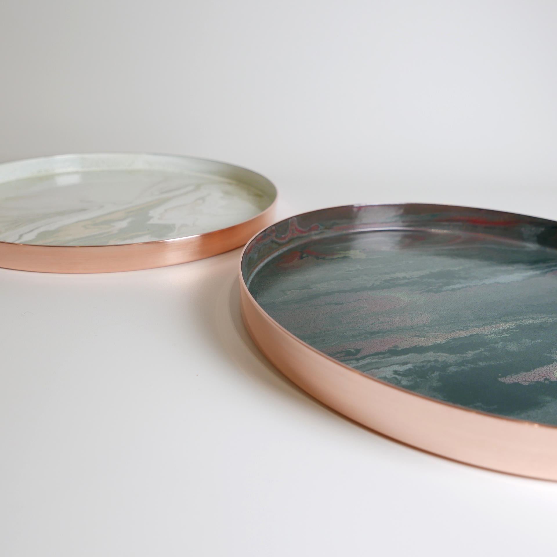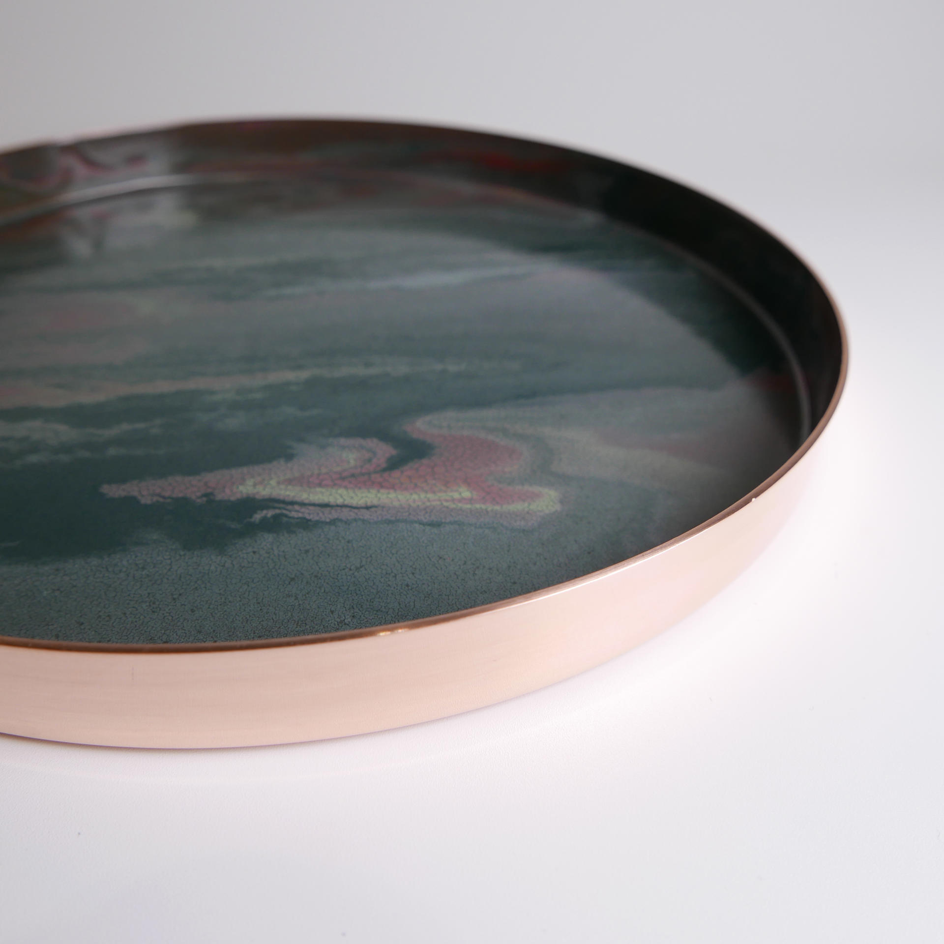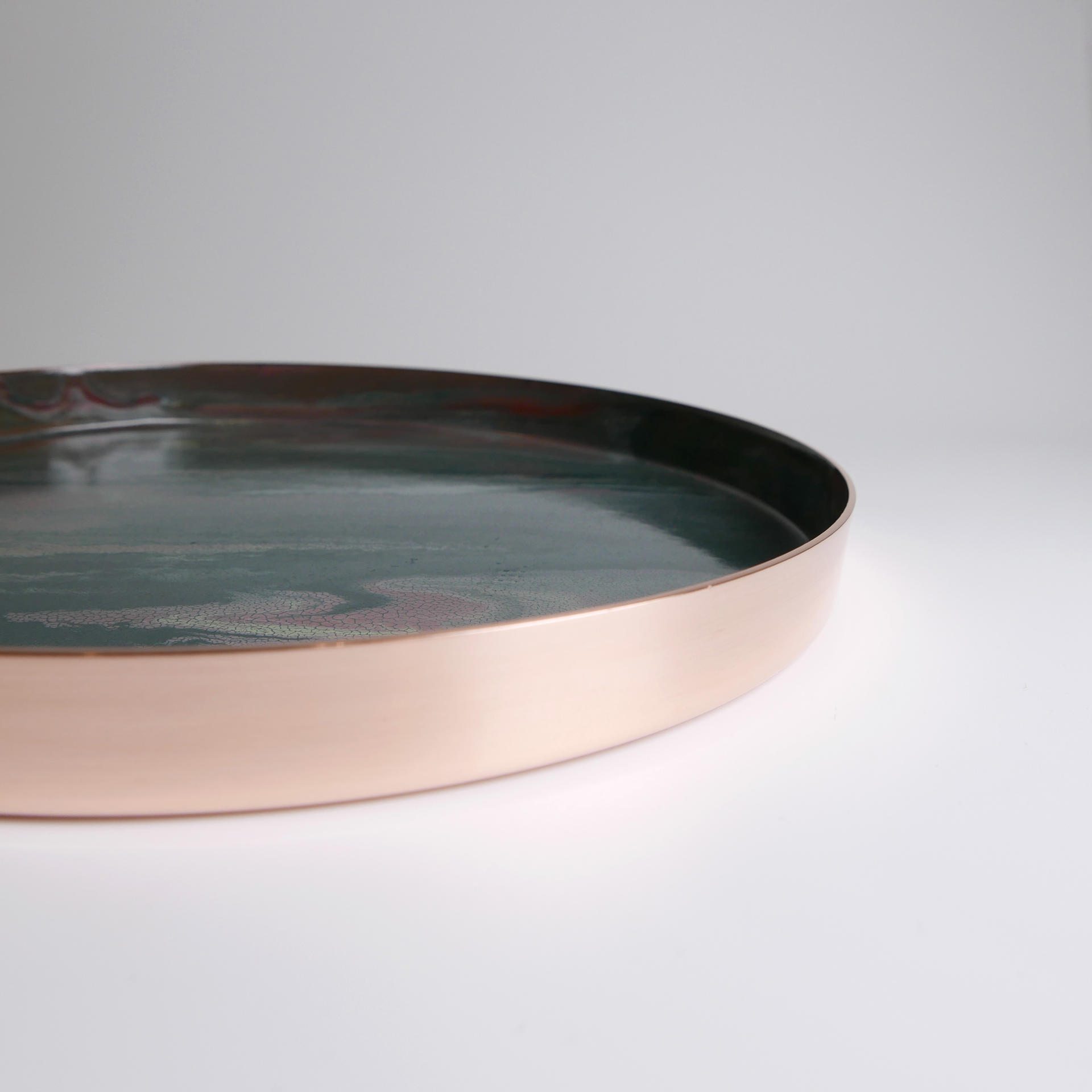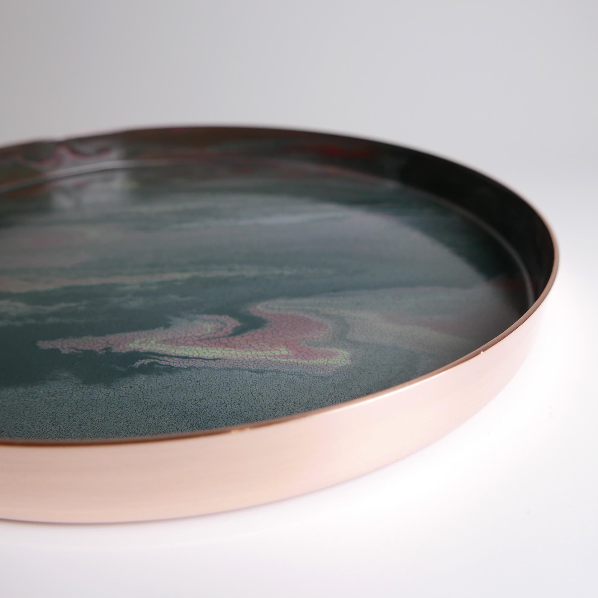 매번 조금씩 다른 유약의 패턴과 색상, 그리고 금속 판재가 열을 받으면서 변형되는 형태.